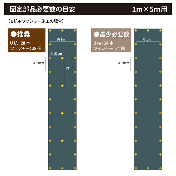◆別売りでU杭やワッシャー、面ファスナーをご用意しております。一緒に使っていただくことで、U杭のすき間から攻める光や水をやめ、防草シート本来の効果を維持できます施工用品注文ページはこちら◆防草シート(人工芝)施工方法商品ページ内の 動画「1分でちょっとわかる!防草シートの魅力」をご覧ください ※動画にて面ファスナーの施工風景が出てきますますが、防草シート関連はU杭とワッシャーでの固定を推奨しています。